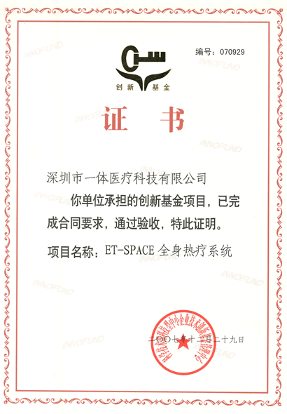 ET-SPACE-I全身熱療系統(tǒng)“熱療證書(shū)”獲得深圳市南山區(qū)經(jīng)濟(jì)促進(jìn)局“2018年度南山區(qū)自主創(chuàng)新產(chǎn)業(yè)發(fā)展專(zhuān)項(xiàng)資金資助款”資助。